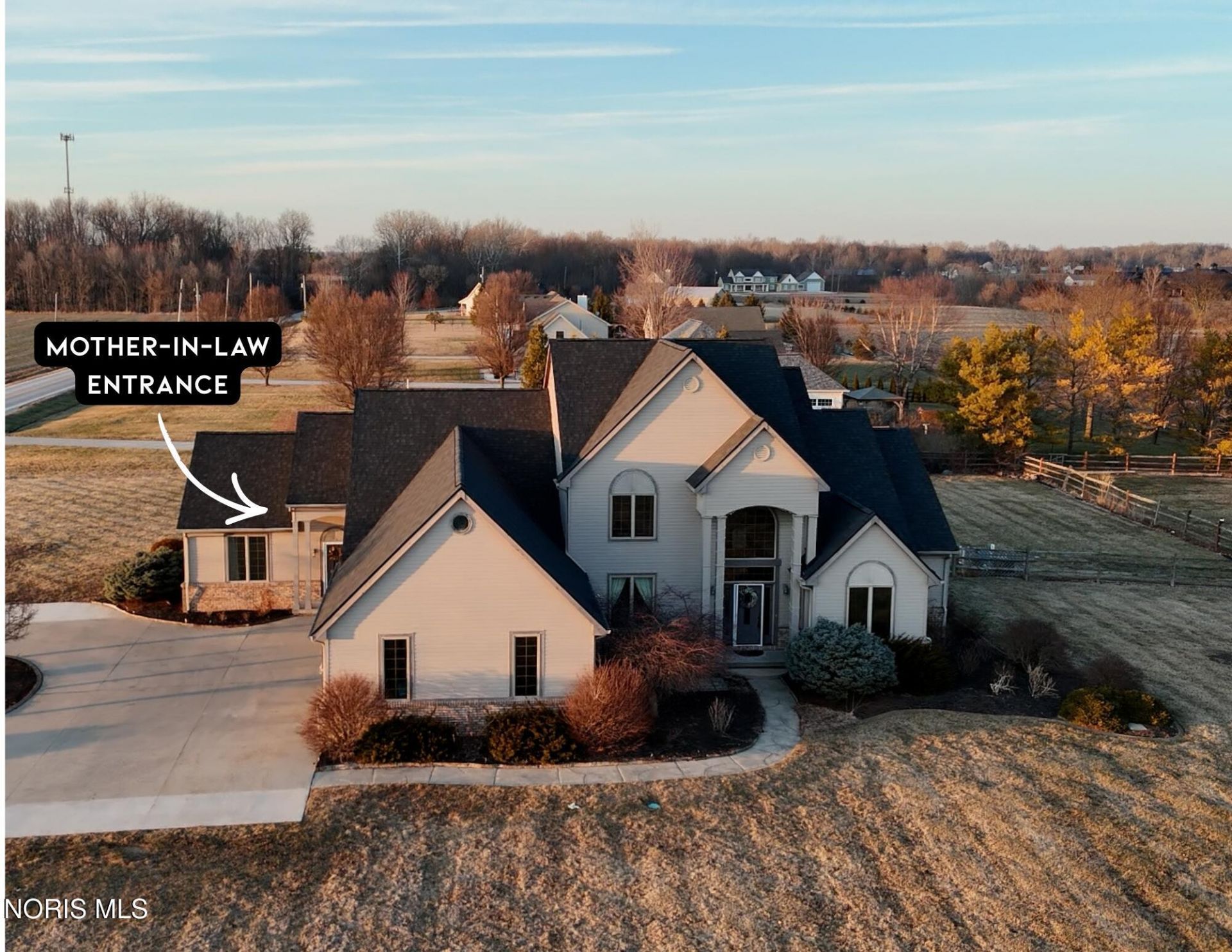 Private Luxury Monclova home with no HOA on almost 2 acres! The hidden secret is this home offers an extremely rare private Guest House / Mother-in-Law Wing entirely under the same roof! The Guest House has a 1st-Floor Primary Suite and walk-in shower, additional full bedroom & full bath, with complete kitchen, grand family room, its own private front door entrance and entirely split utilities. This is an opportunity you don't want to miss for extended family or guests to enjoy complete privacy with ultimate connectivity to the Main Home dwelling spaces. The Main House will impress you with its private Study/Library with rolling ladder and vaulted ceilings, 1st Floor Primary Suite with custom tile shower & Jacuzzi soaking tub, walk-in closet, Grand Foyer and Family Room with 18 ft ceilings, gas fireplace and indoor balcony. The Kitchen has beautiful hardwood floors and stunning hardwood cabinetry, stainless steel Whirlpool appliances, gas stove, a full island and an eat-in breakfast room. With 6 complete bedrooms, a Bonus Room currently used as a playroom, a massive unfinished walk-in attic space above the 3.5 car garage, and a Full Basement yielding an additional 2,467 sq ft, you'll never run out of space! Enjoy the brand new roof with lifetime warranty and 33,000 gallon saltwater pool (see attachments for complete description). This Monclova Township home is mere minutes to immaculate dining and shopping experiences at the Shops at Fallen Timbers, outdoor adventures for biking or walking on the Wabash Cannonball Trail, kid's playground at Keener Park, and fast navigation via Highway US 24 exit at Fallen Timbers. It's also in the Top-Rated A+ School District of Anthony Wayne. This is Ohio Luxury living at its finest. You won't find another home with this level of private customization, intentional space, endless flexibility in such a pristine location.